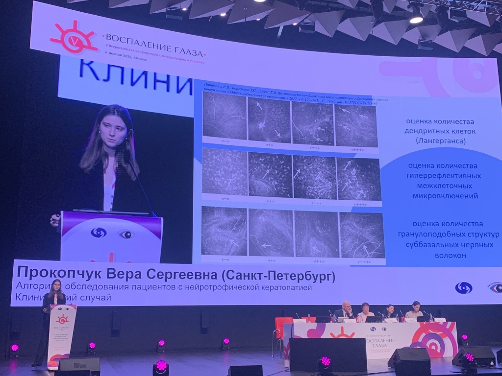Врач-офтальмолог Клиники СПбГУ Вера Прокопчук выступила на V Всероссийской конференции «Воспаление глаза» с двумя докладами, посвященными нейротрофической кератопатии — тяжёлому хроническому заболеванию, приводящему к потере роговицей способности к заживлению из-за повреждения нервных волокон.