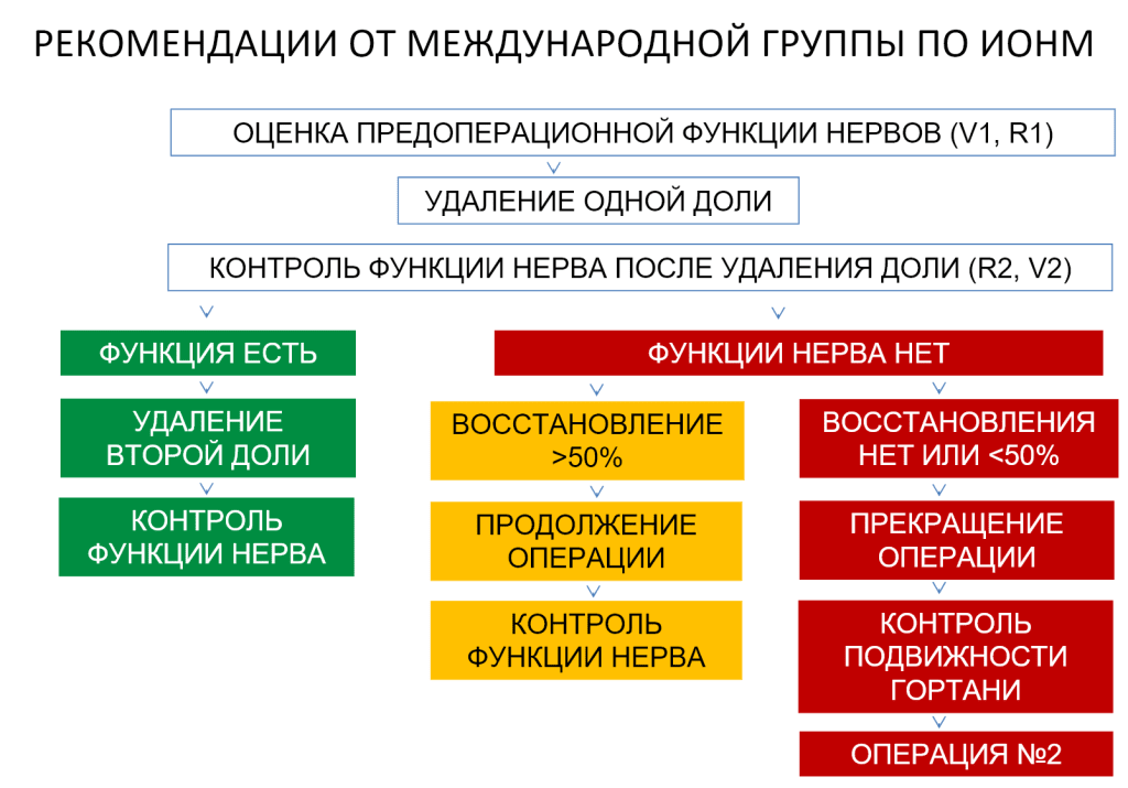 Согласно рекомендациям международной группы по интерпретационному нейромониторингу при возникновении такого грозного электрофизиологического феномена как “потеря сигнала”, рекомендуют остановиться и не переходить на вторую сторону при изначально запланированной манипуляции. Алгоритм действий для эндокринного хирурга представлен на изображении ниже.