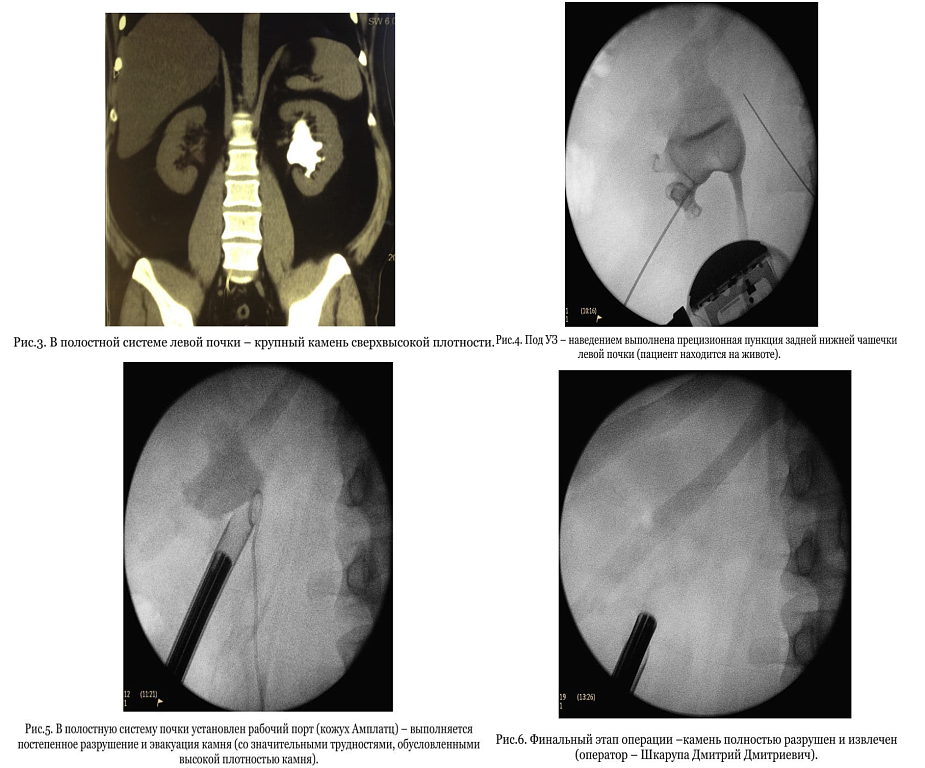 Пациент тридцати лет поступил в Клинику с коралловидными камнями обеих почек. После ДТП он перенес ампутацию обеих ног в связи с развившимся тяжелым остеомиелитом конечностей на фоне сепсиса. Снижение физической активности привело к резорбции костной ткани, повышению кальция в крови, нарушению уродинамики, что на фоне нейрогенных нарушений привело к формированию инфекционных камней. Было выполнено три вмешательства. Камень слева удалось убрать за одну операцию. Справа литотрипсия была выполнена в 2 этапа. На втором этапе удаляли 6 мм фрагмент, оставшийся в чашечке после первого этапа операции. У пациента имелся риск повторного сепсиса, по поводу чего были предприняты соответствующие меры. Сейчас пациент стабилизирован и идёт на поправку.