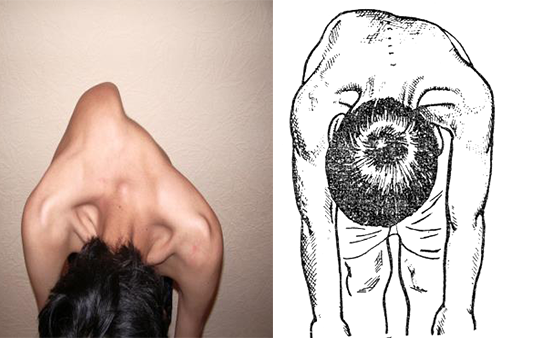 Гиббус (реберный горб) образуется в результате вовлечение грудной клетки в сколиотическую дугу. Идиопатический сколиоз, сопровождается патологическим поворотом (торсией), скручиванием позвонков, которое ведет также и к развитию деформации грудной клетки в виде ее асимметрии и выпячивании ребер в сторону деформации. Горб наиболее хорошо виден при наклоне туловища вперед. Данный прием называется тест Адамса (см. изображения).