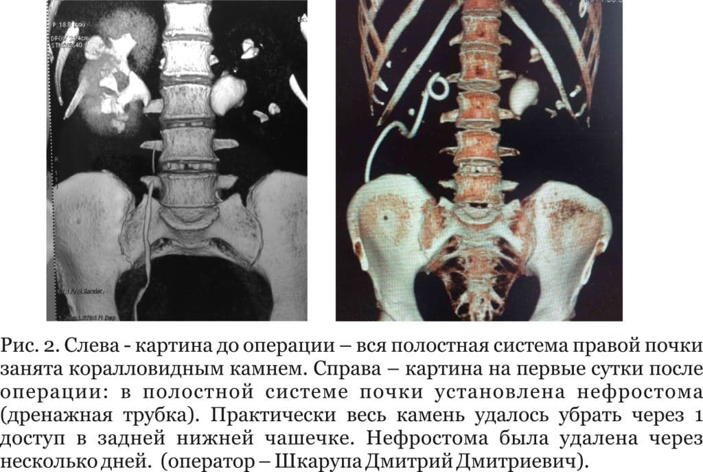 Из рисунка 1 видно, что справа, несмотря на коралловидный камень, почка накапливает и выделяет контрастное вещество (прокрашена ткань почки и мочеточник). Слева виден крупный камень лоханки, а накопления и выделения контраста практически нет – почка не работает (толщина ткани почки не превышает 5 мм при норме 15 мм). Если бы в свое время крупный камень слева был разрушен, почка бы не погибла. А в данной ситуации, если ничего не предпринимать, то это ведёт к развитию хронической почечной недостаточности и гемодиализу.