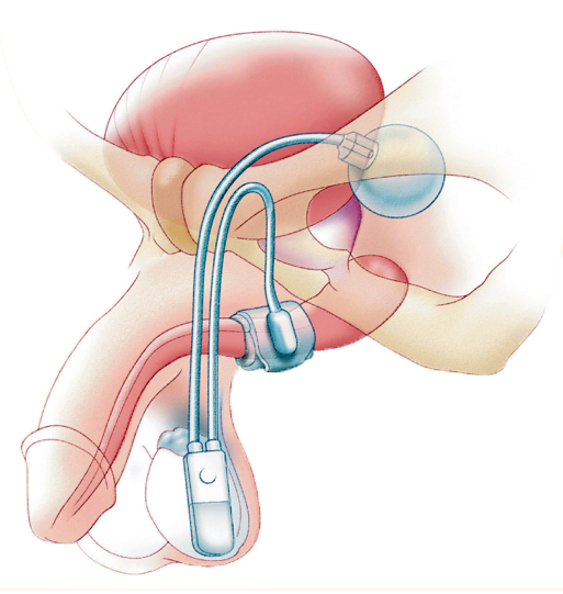 Механизм действия – концентрическое сжатие мочеиспускательного канала манжетой механизма, активация и деактивация манжеты осуществляется с помощью нажатия на кнопку-помпу, имплантируемую в мошонку. Имплантация искусственного сфинктера мочевого пузыря выполняется при средней и тяжелой форме недержания мочи, когда пациент использует более 4 урологических прокладок в сутки, не способен накапливать или частично удерживать мочу, при неэффективности других способов лечения недержания мочи. Являясь самым высокотехнологичным и эффективным методом лечения искусственный сфинктер прост в использовании, требует от пациента минимальных тактильных навыков.