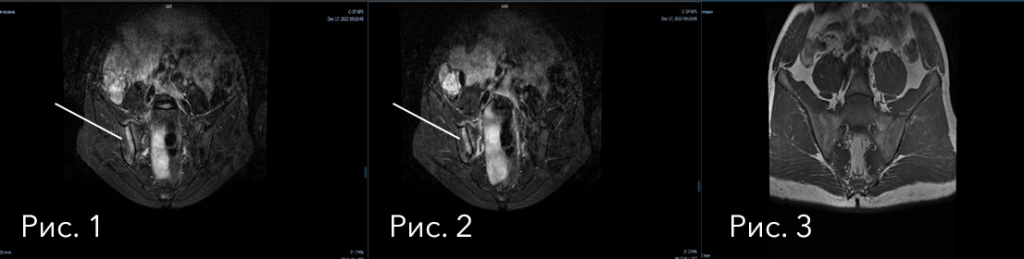На данных изображениях (рис.1-2) можно увидеть «белое пятно» в проекции правого крестцово-подвздошного сочленения. Это ни что иное, как «активный» сакроилиит (отек костного мозга – воспалительные изменения кости), что для ревматолога подчеркивает видимую активность, подтверждая реальную неэффективность проводимой терапии.